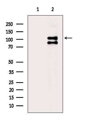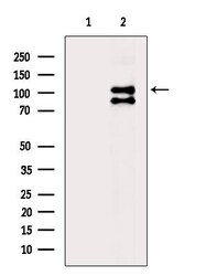 - Western blot analysis of Phospho-ULK1 (Ser450) in extracts from MC-3T3-E1 cells (H2O2 treatment). Samples were incubated with Phospho-ULK1 (Ser450) polyclonal antibody (Product # PA5-105421). The lane on the left was treated with blocking peptide.