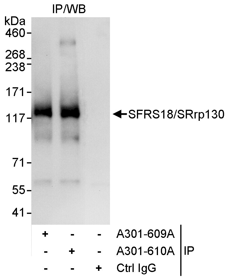 - Detection of human SFRS18/SRrp130 by western blot of immunoprecipitates. Samples: Whole cell lysate (1 mg for IP, 20% of IP loaded) from HeLa cells. Antibodies: Affinity purified rabbit anti-SFRS18/SRrp130 antibody A301-609A used for IP at 3 µg/mg lysate. SFRS18/SRrp130 was also immunoprecipitated by rabbit anti-SFRS18/SRrp130 antibody A301-610A, which recognizes a downstream epitope. For blotting immunoprecipitated SFRS18/SRrp130, A301-610A was used at 1 µg/ml. Detection: Chemiluminescence with an exposure time of 10 seconds.