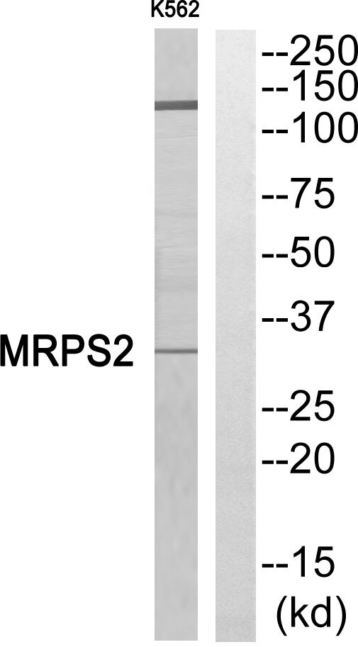 - Western blot analysis of MRPS2 Antibody. The lane on the right is blocked with the MRPS2 peptide.