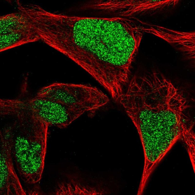 - Immunofluorescent staining of human cell line RH-30 shows localization to nucleus.