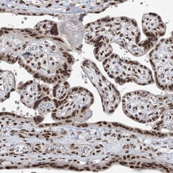 - Immunohistochemical analysis of CGGBP1 in human placenta using CGGBP1 Polyclonal Antibody (Product # PA5-57916) shows strong nuclear positivity in trophoblastic cells.