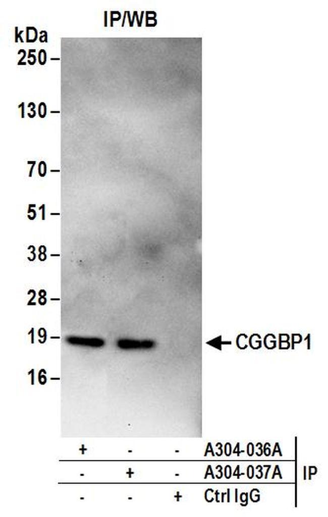 - Detection of human CGGBP1 by western blot of immunoprecipitates. Samples: Whole cell lysate (1 mg for IP; 20% of IP loaded) from 293T cells. Antibodies: Affinity purified rabbit anti-CGGBP1 antibody A304-036A (lot A304-036A-1) used for IP at 6 µg/mg lysate. CGGBP1 was also immunoprecipitated by rabbit anti-CGGBP1 antibody A304-037A. For blotting immunoprecipitated CGGBP1, A304-036A was used at 1 µg/ml. Detection: Chemiluminescence with an exposure time of 30 seconds.