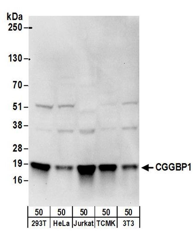 - Detection of human and mouse CGGBP1 by western blot. Samples: Whole cell lysate (50 µg) from 293T, HeLa, Jurkat, mouse TCMK-1, and mouse NIH3T3 cells. Antibodies: Affinity purified rabbit anti-CGGBP1 antibody A304-036A (lot A304-036A-1) used for WB at 0.4 µg/ml. Detection: Chemiluminescence with an exposure time of 10 seconds.