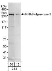 - Detection of mouse RNA Polymerase II by western blot. Samples: Whole cell lysate (15 and 50 µg) from NIH3T3 cells. Antibodies: Affinity purified goat anti-RNA Polymerase II antibody A303-835A (lot A303-835A-1) used for WB at 1 µg/ml. Detection: Chemiluminescence with an exposure time of 30 seconds.