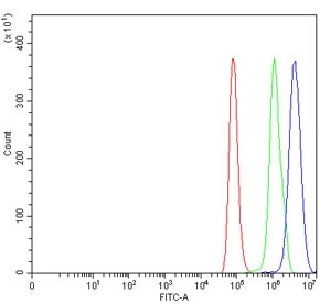 - Flow cytometry testing of human HeLa cells with BRDT antibody at 1ug/million cells (blocked with goat sera); Red=cells alone, Green=isotype control, Blue= BRDT antibody.