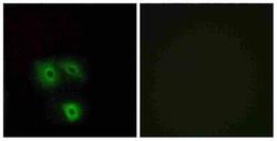 - Western blot analysis of lysates from HeLa cells, using OR5H1 Antibody. The lane on the right is blocked with the synthesized peptide.