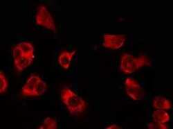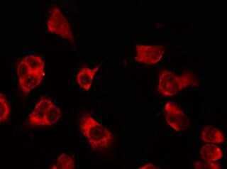 - Immunofluorescent analysis of OR5H1 in HeLa cells. Samples were fixed with paraformaldehyde, permeabilized with 0.1% Triton X-100, blocked with 10% serum (45 min at 25°C) incubated with OR5H1 polyclonal antibody (Product # PA5-103234) using a dilution of 1:200 (1 hr, 37°C), and followed by goat anti-rabbit IgG Alexa Fluor 594 at a dilution of 1:600.