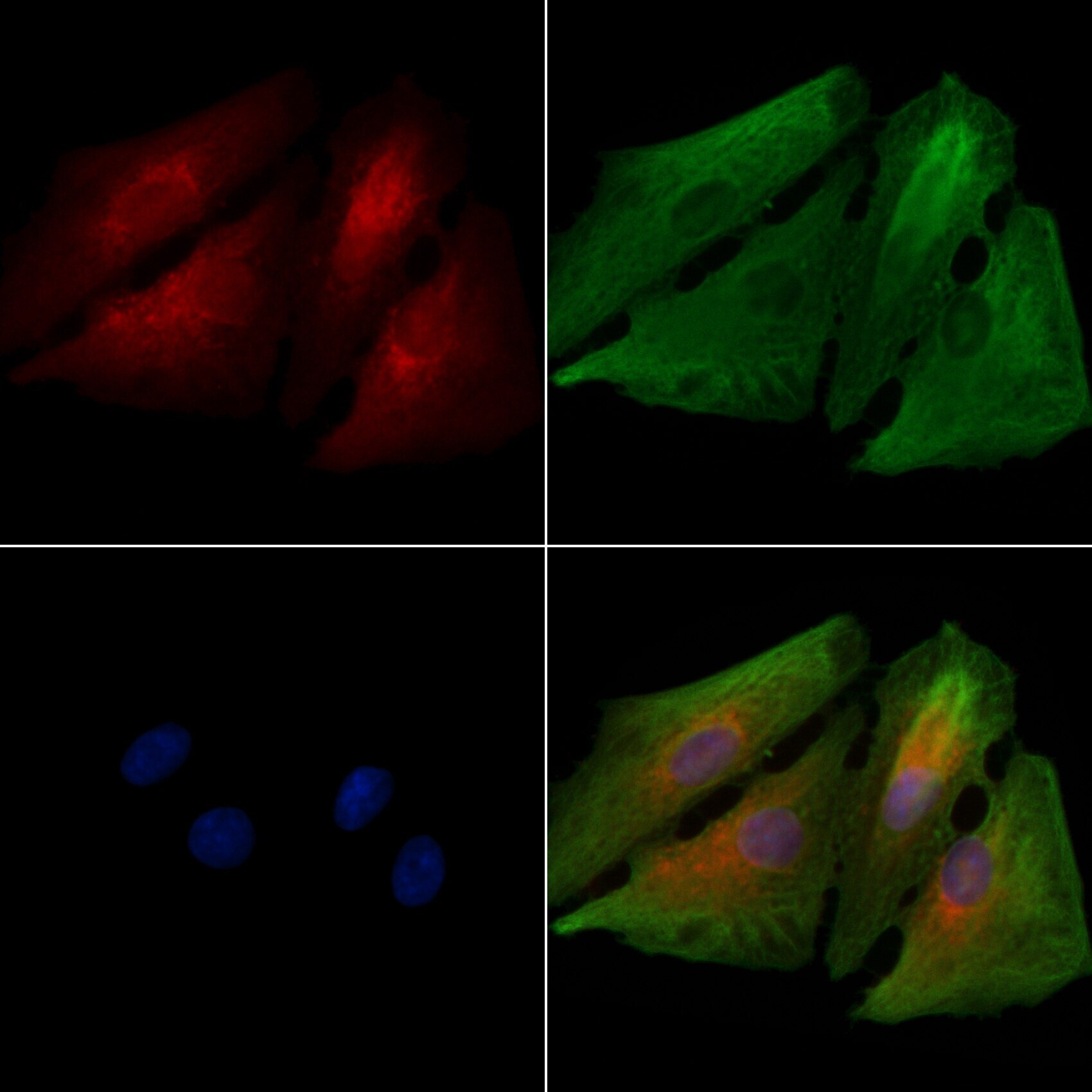 - Immunocytochemistry analysis of OR5H1 in A549 cells. The samples were fixed with PFA and permeabilized in 0.1% Triton X-100, then blocked in 10% serum for 45 minutes at 25°C. Samples were incubated with OR5H1 polyclonal antibody (Product # PA5-103234) and mouse anti-beta tubulin antibody for 1 hour at 37°C. An AlexaFluor594 conjugated goat anti-rabbit IgG(H+L) (Red) and an AlexaFluor488 conjugated goat anti-mouse IgG(H+L) (Green) were used as the secondary antibodies. The nuclear counter stain is DAPI (blue).