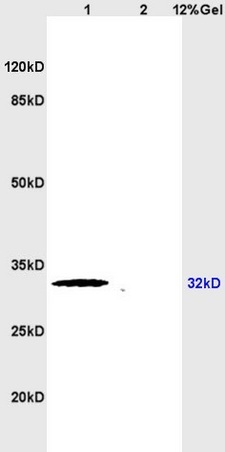 - Lane 1: rat heart lysates Lane 2: rat brain lysates probed with Anti APG5L/ATG5 Polyclonal Antibody, Unconjugated (bs-4005R) at 1:200 in 4°C. Followed by conjugation to secondary antibody (bs-0295G-HRP) at 1:3000 90min in 37°C. Predicted band 32kD. Observed band size: 32kD.