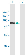 - Western Blot analysis of TTC12 expression in transfected 293T cell line (H00054970-T01) by TTC12 MaxPab polyclonal antibody.Lane 1: TTC12 transfected lysate(80.52 KDa).Lane 2: Non-transfected lysate.