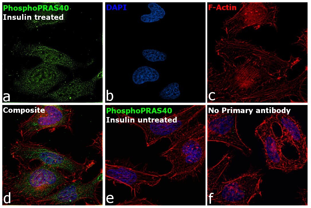 - Immunofluorescence analysis of Proline-rich AKT1 substrate 1 was performed using 70% confluent log phase HeLa cells treated with Insulin (15 nm,20 min).The cells were fixed with 4% paraformaldehyde for 10 minutes, permeabilized with 0.1% Triton™ X-100 for 15 minutes, and blocked with 2% BSA for 45 minutes at room temperature. The cells were labeled with Phospho-PRAS40 (Thr246) Polyclonal Antibody (Product # PA5-97402) at 5 µg/mL in 0.1% BSA, incubated at 4 degree celsius overnight and then labeled with Goat anti-Rabbit IgG (H+L) Superclonal™ Recombinant Secondary Antibody, Alexa Fluor® 488 conjµgate (Product # A27034), (1:2000 dilution), for 45 minutes at room temperature (Panel a: Green). Nuclei (Panel b:Blue) were stained with ProLong™ Gold Antifade Mountant (Product # P36930). F-actin (Panel c: Red) was stained with Rhodamine Phalloidin (Product # R415, 1:300 dilution). Panel d represents the merged image showing Plasma membrane localization. Panel e represents no expression in untreated cells Panel f represents control cells with no primary antibody to assess background. The images were captured at 60X magnification.