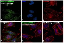 - Immunofluorescence analysis of Proline-rich AKT1 substrate 1 was performed using 70% confluent log phase HeLa cells treated with Insulin (15 nm,20 min).The cells were fixed with 4% paraformaldehyde for 10 minutes, permeabilized with 0.1% Triton™ X-100 for 15 minutes, and blocked with 2% BSA for 45 minutes at room temperature. The cells were labeled with Phospho-PRAS40 (Thr246) Polyclonal Antibody (Product # PA5-97402) at 5 µg/mL in 0.1% BSA, incubated at 4 degree celsius overnight and then labeled with Goat anti-Rabbit IgG (Heavy Chain) Superclonal™ Recombinant Secondary Antibody, Alexa Fluor® 488 conjµgate (Product # A27034), (1:2000 dilution), for 45 minutes at room temperature (Panel a: Green). Nuclei (Panel b:Blue) were stained with ProLong™ Gold Antifade Mountant (Product # P36930). F-actin (Panel c: Red) was stained with Rhodamine Phalloidin (Product # R415, 1:300 dilution). Panel d represents the merged image showing Plasma membrane localization. Panel e represents no expression in untreated cells Panel f represents control cells with no primary antibody to assess background. The images were captured at 60X magnification.