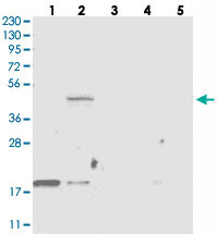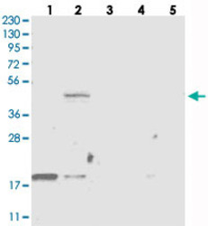 - Western blot analysis of Lane 1: RT-4, Lane 2: U-251 MG, Lane 3: Human Plasma, Lane 4: Liver, Lane 5: Tonsil with THNSL2 polyclonal antibody (Cat # PAB22681).