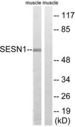 - Western blot analysis of extracts from rat muscle cells, using SESN1 antibody. The lane on the right is treated with the synthesized peptide.