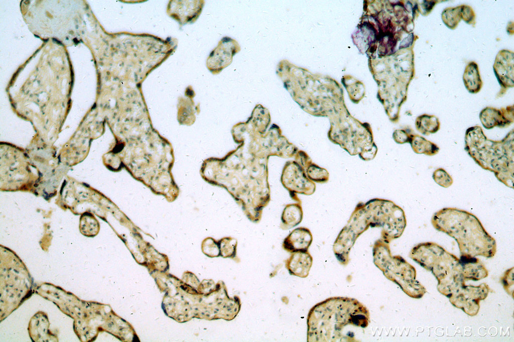 - Immunohistochemical of paraffin-embedded human placenta using 15598-1-AP(REX2 antibody) at dilution of 1:50 (under 10x lens)