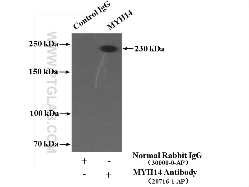 - IP result of anti-MYH14 (IP:20716-1-AP, 4ug; Detection:20716-1-AP 1:2000) with mouse kidney tissue lysate 4800ug.