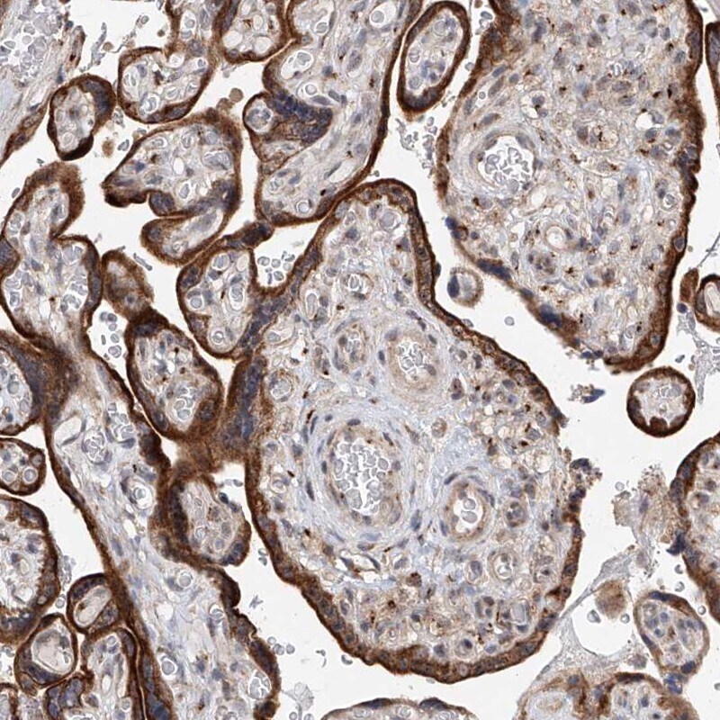 - Immunohistochemical staining of KIAA1919 in human placenta using a KIAA1919 Polyclonal Antibody (Product # PA5-56859) shows cytoplasmic positivity in trophoblastic cells.