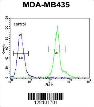 - KPRA Antibody (N-term) (Cat. #AP10399a) flow cytometric analysis of MDA-MB435 cells (right histogram) compared to a negative control cell (left histogram).FITC-conjugated goat-anti-rabbit secondary antibodies were used for the analysis.