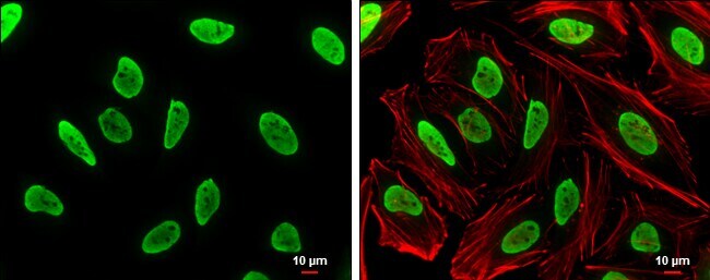 - Immunofluorescent analysis of hnRNP A2B1 showing staining in the nucleus of HeLa cells. HeLa cells were fixed in 4% paraformaldehyde at RT for 15 min and stained using a hnRNP A2B1 polyclonal antibody (Product # PA5-34939) diluted at 1:500. Blue: Hoechst 33342 staining. Scale bar = 10µm.