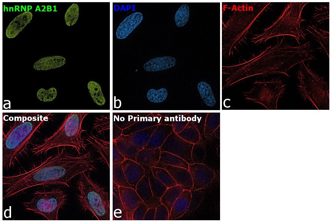 - Immunofluorescence analysis of hnRNP A2B1 was performed using 70% confluent log phase MCF7 cells. The cells were fixed with 4% paraformaldehyde for 10 minutes, permeabilized with 0.1% Triton™ X-100 for 15 minutes, and blocked with 2% BSA for 45 minutes at room temperature. The cells were labeled with hnRNP A2B1 Polyclonal Antibody (Product # PA5-34939) at 1:200 in 0.1% BSA, incubated at 4 degree celsius overnight and then labeled with Donkey anti-Rabbit IgG (H+L) Highly Cross-Adsorbed Secondary Antibody, Alexa Fluor Plus 488 (Product # A32790), (1:2000), for 45 minutes at room temperature (Panel a: Green). Nuclei (Panel b:Blue) were stained with ProLong™ Diamond Antifade Mountant with DAPI (Product # P36962). F-actin (Panel c: Red) was stained with Rhodamine Phalloidin (Product # R415, 1:300). Panel d represents the merged image showing Nuclear localization. Panel e represents control cells with no primary antibody to assess background. The images were captured at 60X magnification.