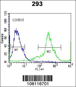 - Kallikrein 6 (KLK6) Antibody (Center) Antibody (Cat. #TA324833) flow cytometric analysis of 293 cells (right histogram) compared to a negative control cell (left histogram).FITC-conjugated goat-anti-rabbit secondary antibodies were used for the analysis.