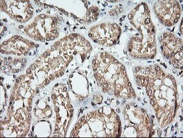 - Immunohistochemical staining of paraffin-embedded human Kidney tissue within the normal limits using anti-KLK8 mouse monoclonal antibody. (Heat-induced epitope retrieval by 10mM citric buffer, pH6.0, 120°C for 3min, TA506135)