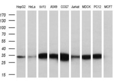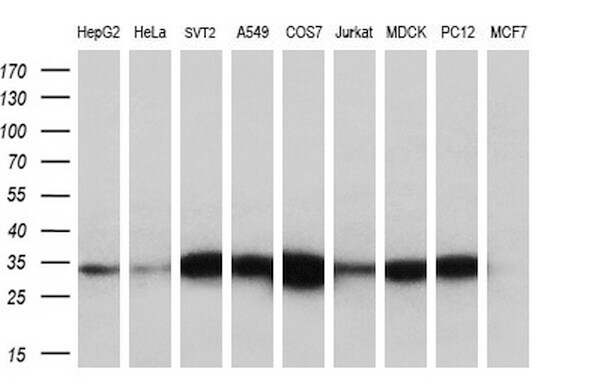 - Western blot analysis of extracts (35 µg) from 9 different cell lines by using anti-KLK8 monoclonal antibody (HepG2: human; HeLa: human; SVT2: mouse; A549: human; COS7: monkey; Jurkat: human; MDCK: canine; PC12: rat; MCF7: human). (1:200)