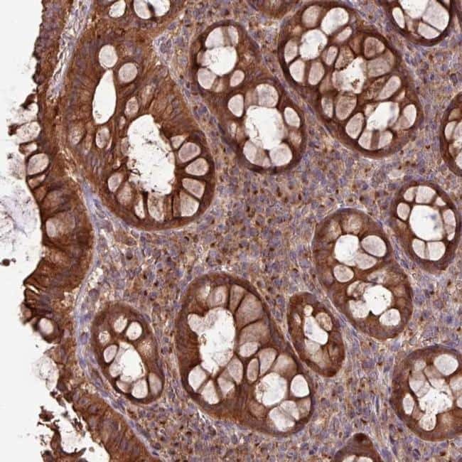 - Immunohistochemical analysis of RAB19 in human rectum using RAB19 Polyclonal Antibody (Product # PA5-62310) shows strong cytoplasmic positivity in glandular cells.