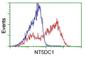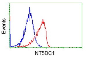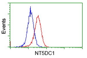- HEK293T cells transfected with either RC211087 overexpress plasmid(Red) or empty vector control plasmid(Blue) were immunostained by anti-NT5DC1 antibody(TA501590), and then analyzed by flow cytometry.