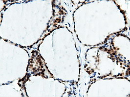 - Immunohistochemical staining of paraffin-embedded Human thyroid tissue within the normal limits using anti-NT5DC1 mouse monoclonal antibody. (Heat-induced epitope retrieval by 10mM citric buffer, pH6.0, 100C for 10min, TA501590)