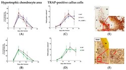 - Figure 5 Hypertrophic cartilage area and number of TRAP-positive callus cells . ( A , B ) Number/area of hypertrophic chondrocytes, visualized by collagen X staining, in Tac1-/-, alpha-CGRP-/- ( A ), SYX ( B ), and WT mice ( A , B ) at the time points 5, 9, 13, 16, and 21 days after fracture. Values were calculated as a percentage of total callus area and are presented as mean +- SD. * in black indicates differences between neurotransmitter deficient mice and WT animals. ( C , D ) Number of TRAP-positive cells in the callus tissue of Tac1-/-, alpha-CGRP-/- ( C ), SYX ( D ), and WT mice ( C , D ) at the time points 5, 9, 13, 16, and 21 days after fracture. The number of cells was calculated in relation to the total area of callus tissue as number/mm 2 . ( E ) Representative image of collagen X stained hypertrophic callus area of an alpha-CGRP-/- mouse 13 days after fracture. ( F ) Representative image of TRAP-positive callus cells 16 days after fracture in the callus tissue of a WT mouse. Overview images scanned with 20x magnification (TissueFAXSi plus). Red boxes demonstrate the enlarged view. Red arrow points to stained cells. Col X = collagen X; B = bone, C = Callus tissue, F = Fracture site, M = Muscle. * = p