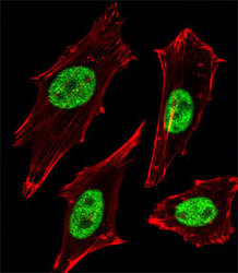 - Immunofluorescent staining of Hela cells reacted with MGMT monoclonal antibody (Cat # MAB12338) at 1:25 dilution.