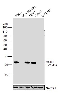- Western Blot was performed using Anti-MGMT Monoclonal Antibody (MT 3.1) (Product # MA5-13506) and a 22 kDa band corresponding to Methylated-DNA-protein-cysteine methyltransferase was observed across positive cell lines (HeLa, MCF7 and Jurkat); and not in negative cell lines (MDA-MB-231 and U-87 MG) tested. Nuclear enriched extracts (30 µg lysate) of HeLa (Lane 1), MDA-MB-231 (Lane 2), MCF7 (Lane 3), Jurkat (Lane 4) and U-87 MG (Lane 5) were electrophoresed using NuPAGE™ 12% Bis-Tris Protein Gel (Product # NP0341BOX). Resolved proteins were then transferred onto a Nitrocellulose membrane (Product # IB23001) by iBlot® 2 Dry Blotting System (Product # IB21001). The Blot was probed with the primary antibody (1:50 dilution) and detected by chemiluminescence with Goat anti-Mouse IgG (H+L) Superclonal™ Recombinant Secondary Antibody, HRP (Product # A28177, 1:4000 dilution) using the iBright FL 1000 (Product # A32752). Chemiluminescent detection was performed using Novex® ECL Chemiluminescent Substrate Reagent Kit (Product # WP20005).