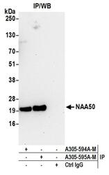 - Detection of human NAA50 by western blot of immunoprecipitates. Samples: Whole cell lysate (0.5 or 1.0 mg per IP reaction; 20% of IP loaded) from 293T cells prepared using NETN lysis buffer. Antibodies: Affinity purified rabbit anti-NAA50 antibody A305-594A-M (lot A305-594A-M-1) used for IP at 8 µl per reaction. NAA50 was also immunoprecipitated by rabbit anti-NAA50 antibody A305-595A-M. For blotting immunoprecipitated NAA50, A305-594A-M was used at 1:1000. Detection: Chemiluminescence with an exposure time of 30 seconds.