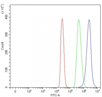 - Flow cytometry testing of fixed and permeabilized human 293T cells with Heparin cofactor 2 antibody at 1ug/million cells (blocked with goat sera); Red=cells alone, Green=isotype control, Blue= Heparin cofactor 2 antibody.