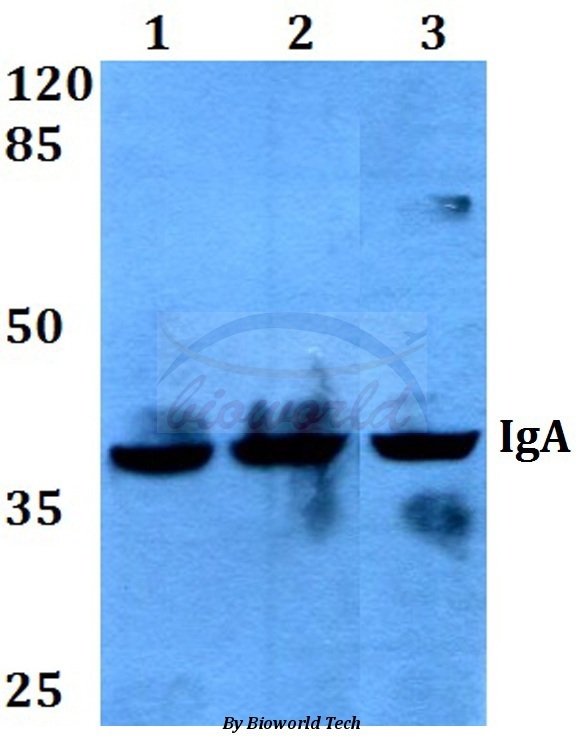 - Western blot (WB) analysis of IgA (Y276) pAb at 1:500 dilutionLane1:Hela whole cell lysateLane2:Jurkat whole cell lysateLane3:H9C2 whole cell lysate