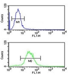 - IGH antibody flow cytometric analysis of HL-60 cells (green) compared to a negative control cell (blue). FITC-conjugated goat-anti-rabbit secondary Ab was used for the analysis.
