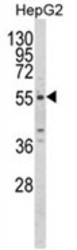 - Western blot analysis of MFRP Antibody (C-term) (AP18114PU-N) in HepG2 cell line lysates (35ug/lane). MFRP (arrow) was detected using the purified Pab.