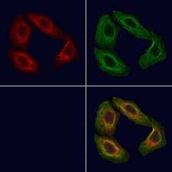 - Immunofluorescent analysis of POMGNT1 in HeLa cells. Samples were fixed with paraformaldehyde, permeabilized with 0.1% Triton X-100, blocked with 10% serum (45 min at 25°C), incubated with mouse anti-beta tubulin and POMGNT1 polyclonal antibody (Product # PA5-100281) using a dilution of 1:200 (1 hr, 37°C), and followed by goat anti-rabbit IgG Alexa Fluor 594 (red) and goat anti-mouse IgG Alexa Fluor 488 (green).