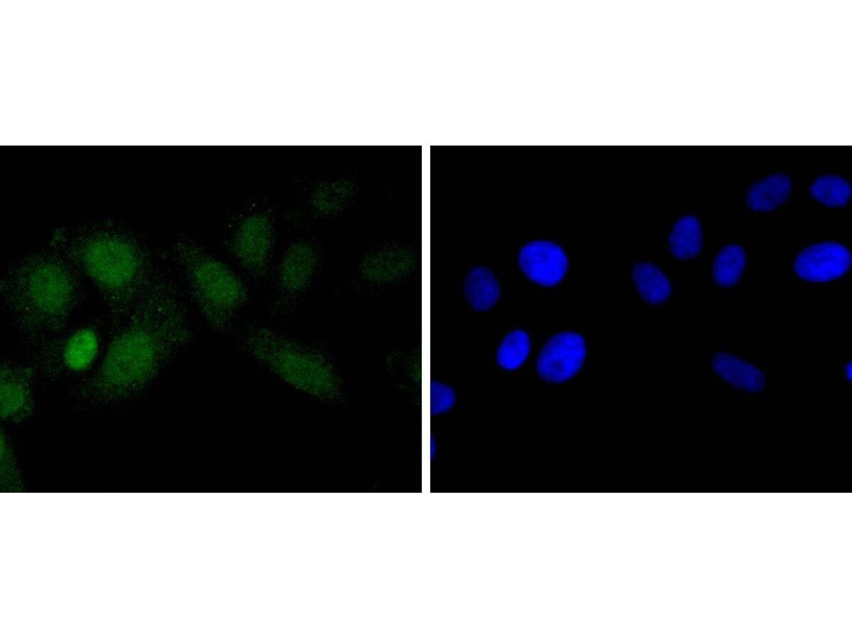 - Immunocytochemistry/Immunofluorescence analysis of EZH2 in HepG2 cells (green). Formalin fixed cells were permeabilized with 0.1% Triton X-100 in TBS for 10 minutes at room temperature and blocked with 1% Blocker BSA for 15 minutes at room temperature. Cells were probed with EZH2 Recombinant Monoclonal Antibody (Product # MA5-41194) at a dilution of 1:50 for 1 hour at room temperature, washed with PBS. Alexa Fluor®488 Goat anti-Rabbit IgG was used as the secondary antibody at 1:1,000 dilution. The nuclear counter stain is DAPI (blue).