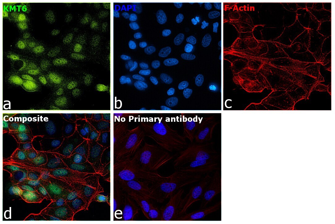 - Immunofluorescence analysis of EZH2 was performed using 70% confluent log phase MCF7 cells. The cells were fixed with 4% paraformaldehyde for 15 minutes, permeabilized with 0.1% Triton™ X-100 for 15 minutes, and blocked with 2% BSA for 45 minutes at room temperature. The cells were labeled with KMT6/EZH2 Recombinant Rabbit Monoclonal Antibody [JJ089-9] (Product # MA5-41194) at 1:100 dilution in 0.1% BSA, incubated at 4 degree celsius overnight and then labeled with Donkey anti-Rabbit IgG (H+L) Highly Cross-Adsorbed Secondary Antibody, Alexa Fluor Plus 488 (Product # A32790), (1:2000 dilution), for 45 minutes at room temperature (Panel a: Green). Nuclei (Panel b:Blue) were stained with ProLong™ Diamond Antifade Mountant with DAPI (Product # P36962). F-actin (Panel c: Red) was stained with Rhodamine Phalloidin (Product # R415, 1:300 dilution). Panel d represents the merged image showing nuclear localization. Panel e represents control cells with no primary antibody to assess background. The images were captured at 60X magnification.
