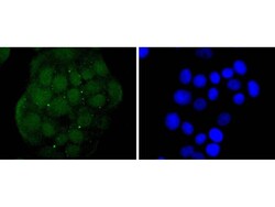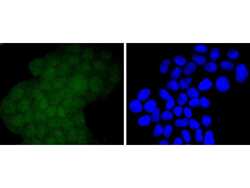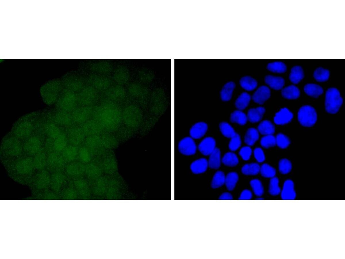 - Immunocytochemistry/Immunofluorescence analysis of EZH2 in MCF-7 cells (green). Formalin fixed cells were permeabilized with 0.1% Triton X-100 in TBS for 10 minutes at room temperature and blocked with 1% Blocker BSA for 15 minutes at room temperature. Cells were probed with EZH2 Recombinant Monoclonal Antibody (Product # MA5-41194) at a dilution of 1:50 for 1 hour at room temperature, washed with PBS. Alexa Fluor®488 Goat anti-Rabbit IgG was used as the secondary antibody at 1:1,000 dilution. The nuclear counter stain is DAPI (blue).