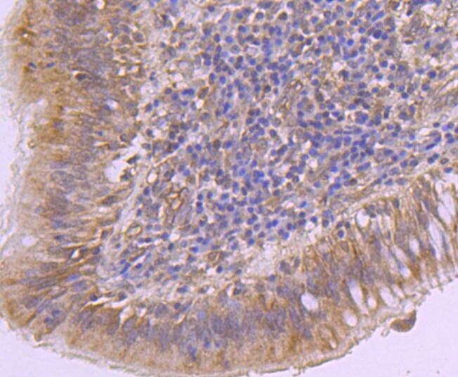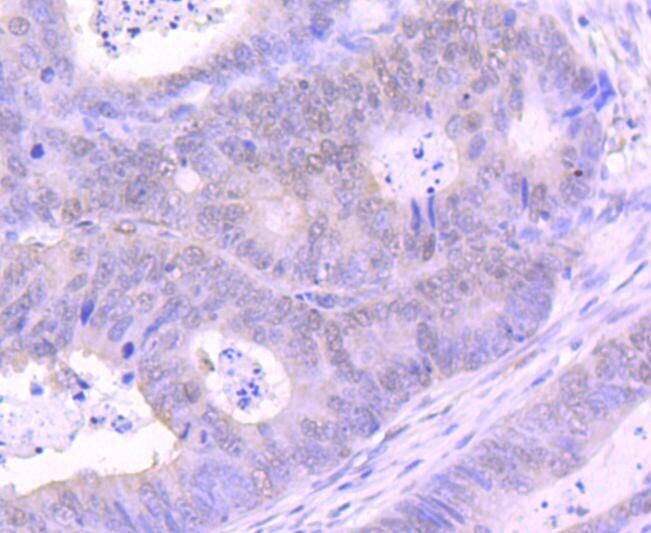 - Immunohistochemistry (Paraffin) analysis of EZH2 in paraffin-embedded human colon carcinoma tissue. The section was pre-treated using heat mediated antigen retrieval with Tris-EDTA buffer (pH 8.0-8.4) for 20 minutes.The tissues were blocked in 5% BSA for 30 minutes at room temperature, washed with ddH2O and PBS, and then probed with EZH2 Recombinant Monoclonal Antibody (Product # MA5-41194) at a dilution of 1:50 for 30 minutes at room temperature. The detection was performed using an HRP conjugated compact polymer system. DAB was used as the chromogen. Tissues were counterstained with hematoxylin and mounted with DPX.