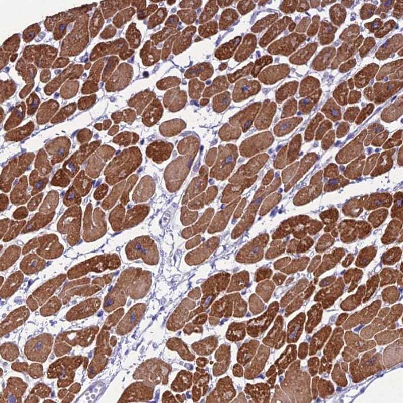 - Immunohistochemical analysis of KIAA0408 in human heart muscle using KIAA0408 Polyclonal Antibody (Product # PA5-60595) shows strong cytoplasmic positivity in cardiomyocytes.