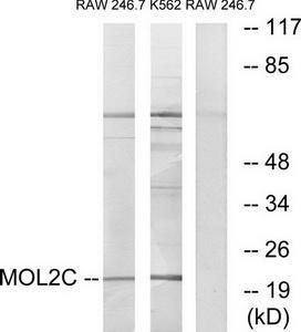 - Western blot analysis of extracts from RAW264.7 cells and K562 cells, using MOL2C antibody.The lane on the right is treated with the synthesized peptide.