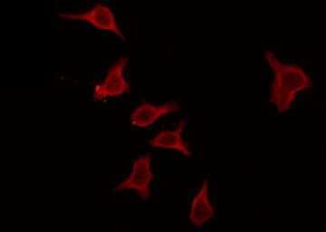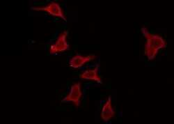 - Immunofluorescent analysis of Mob3C in RAW264.7 cell. Samples were fixed with paraformaldehyde, permeabilized with 0.1% Triton X-100, blocked with 10% serum (45 min at 25°C) incubated with Mob3C polyclonal antibody (Product # PA5-99653) using a dilution of 1:200 (1 hr, 37°C), and followed by goat anti-rabbit IgG Alexa Fluor 594 at a dilution of 1:600.