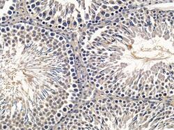 - Immunohistochemistry analysis of Mob3C in rat testis tissue. The sample was formaldehyde fixed and a heat mediated antigen retrieval step in citrate buffer was performed. Samples were incubated with Mob3C polyclonal antibody (Product # PA5-99653) using a dilution of 1:100 (4°C overnight) followed by HRP conjugated anti-Rabbit secondary antibody.
