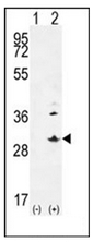 - Western blot analysis of MOBKL2C Antibody (Center) Cat.-No AP52719PU-N. 293 cell lysates (2 ug/lane) either nontransfected (Lane 1) or transiently transfected (Lane 2) with the MOBKL2C gene.
