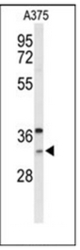 - Western blot analysis of MOBKL2C Antibody (Center) Cat.-No AP52719PU-N in A375 cell line lysates (35ug/lane). MOBKL2C (arrow) was detected using the purified Pab.