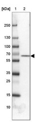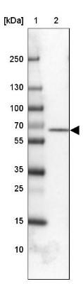 - Western Blot: TMC4 Antibody [NBP2-13437] - Lane 1: Marker [kDa] 250, 130, 100, 70, 55, 35, 25, 15, 10. Lane 2: Human cell line RT-4